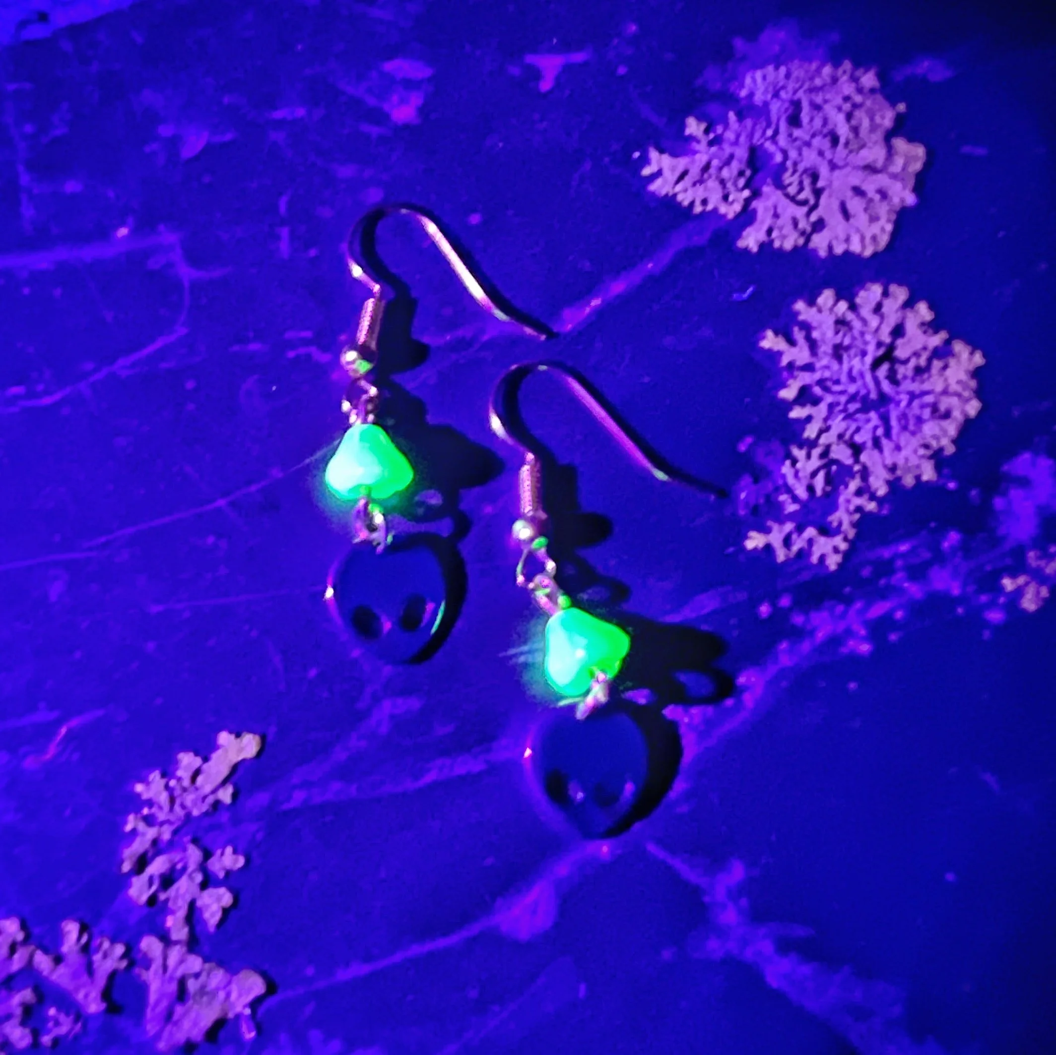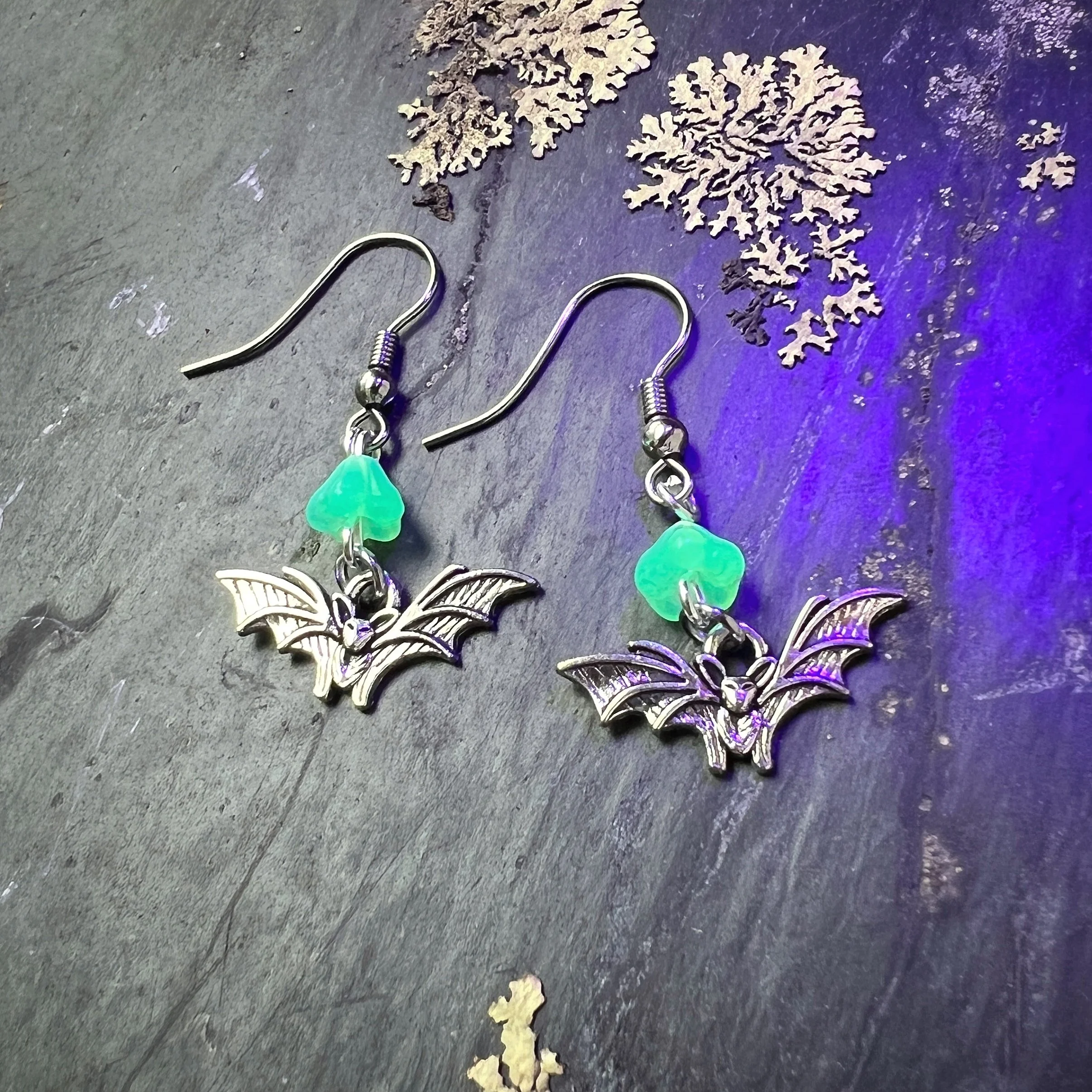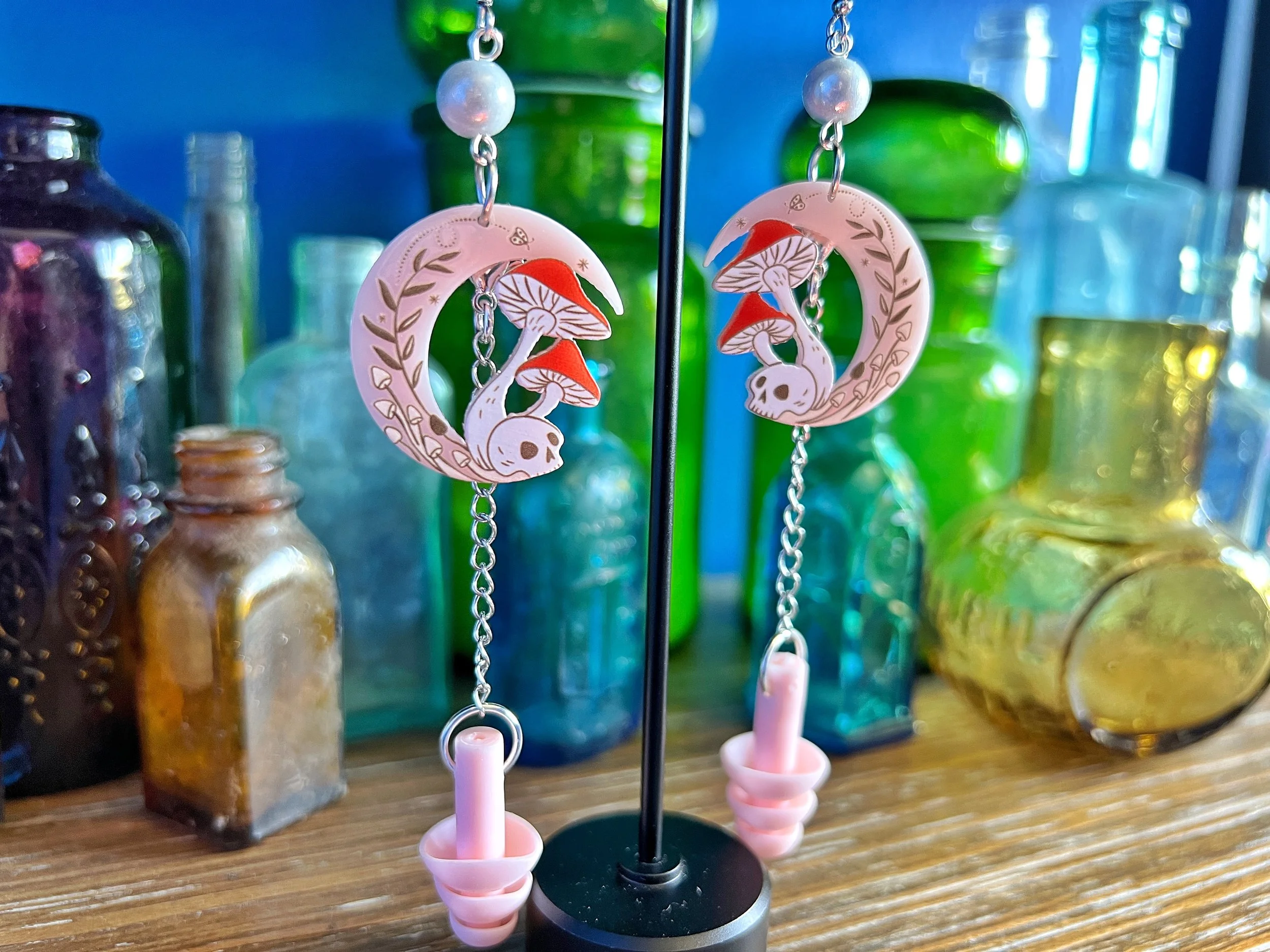Czech Uranium Glass Earplug Silver Ear Cuffs with small mushroom Charms - Sensory Jewelry for Sound Sensitivity